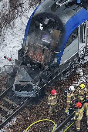 Pociąg Rzeszów - Szczecin uderzył w auto pod Warszawą, był pożar [FOTO]